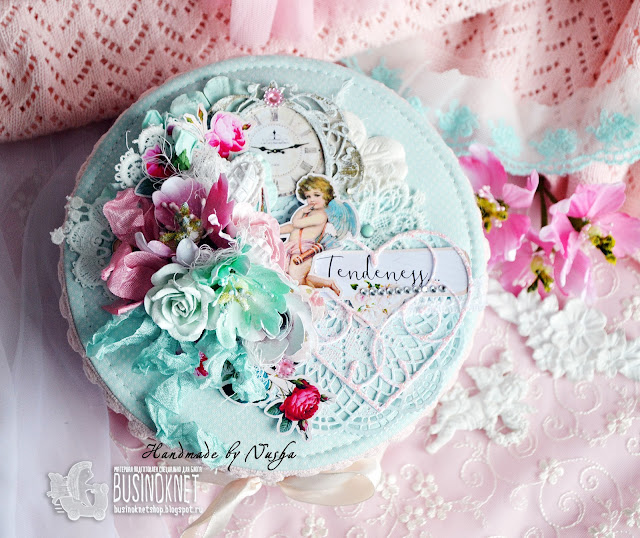 У меня круглая шкатулка под свадебный альбом круглой формы. Использовала нежнейшую бумагу и высечки одноименной коллекции "Нежность" от MONA design, она удивительно хороша!!! Стилистически очень выдержанная, и прорисовка приятно удивила. А еще прекрасное качество высечки! Результат не заставил себя ждать))):